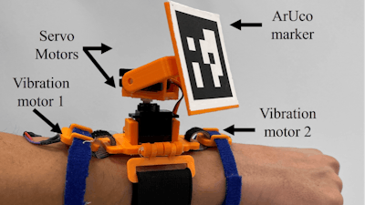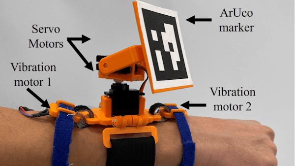 The wearable robotic, named ArUcoGlide, straps to the forearm and has a movable platform with an ArUco marker connected to it. The imaginative and prescient system acknowledges the ArUco marker to trace the placement of the wearer’s arm. Powered by an ESP32 microcontroller and two SG90 servo motors, the place of the platform is adjusted by a base laptop (through a Bluetooth connection) when occlusions happen that will in any other case obscure the marker from the view of the digicam.