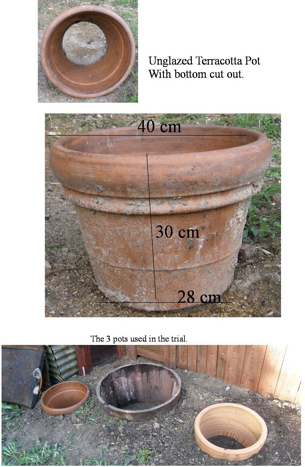 completely different sized composts in 3 completely different sized bottomless containers. Unglazed terracotta
