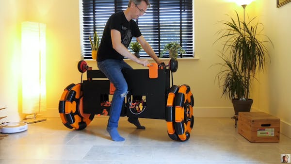 Like a Segway and most different balancing robots and automobiles, hoverboards work by controlling inertia. If the rider suggestions too far ahead, the hoverboard accelerates ahead and the inertia of the rider’s mass retains them upright till they’re balancing once more. To allow steering, the hoverboard’s two wheels have to work independently with a joint between them. The {hardware} to attain that features a controller on all sides that has a gyroscope, an IMU (inertial measurement unit), and a motor driver. These management motors which are fairly highly effective. That’s fairly a little bit of helpful {hardware} for such an inexpensive automobile and it gave Bruton most of what he wanted for his omni wheel bike.